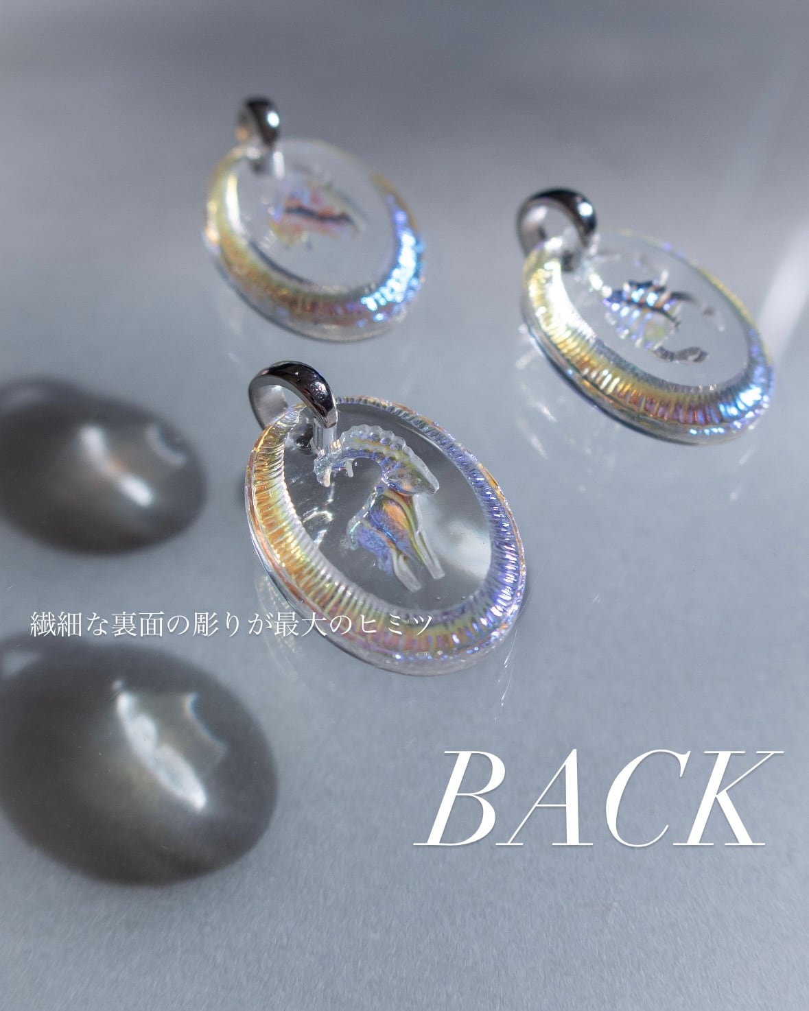 表から見ると 透明なガラスの中にモチーフが浮かんでいるように見える
