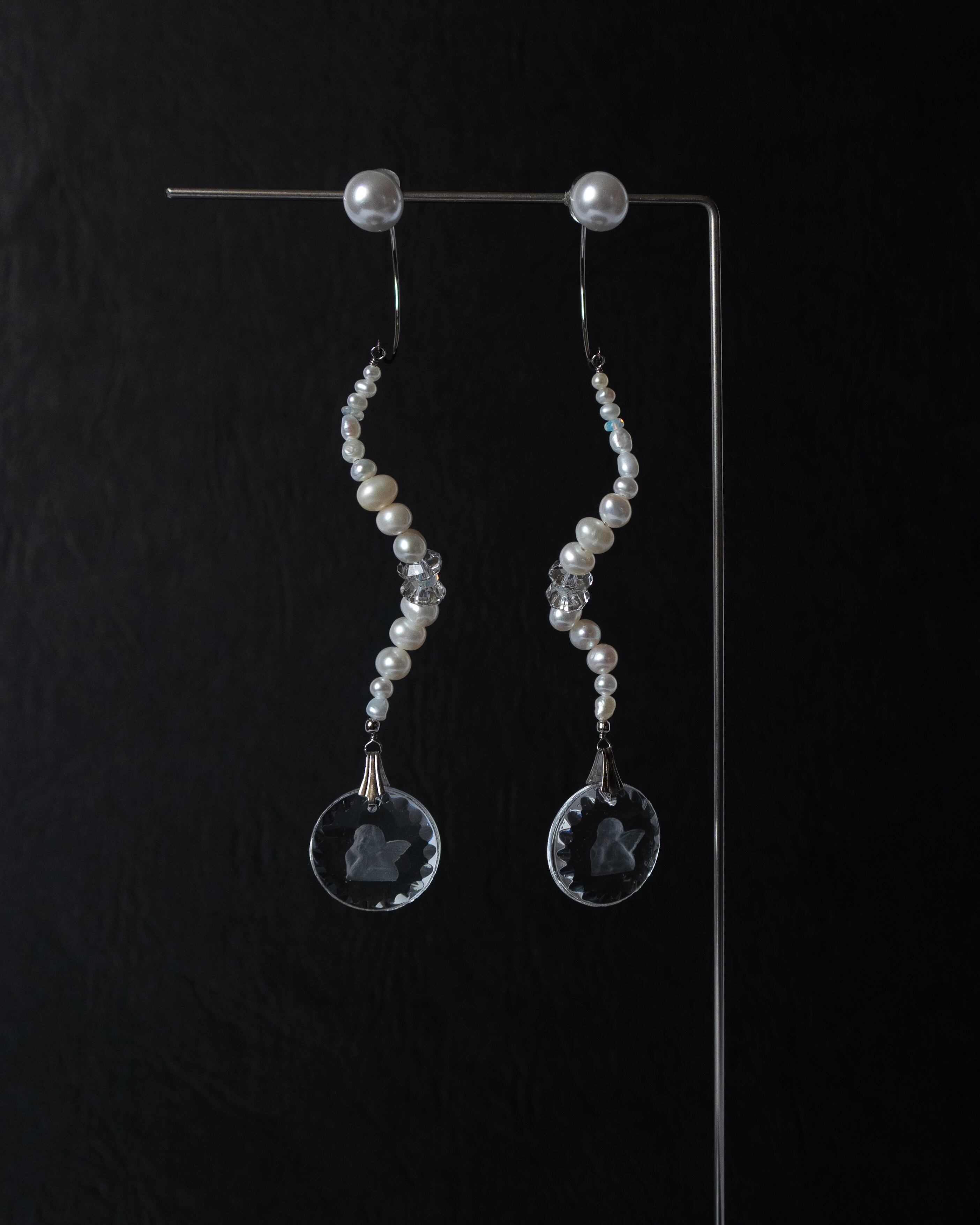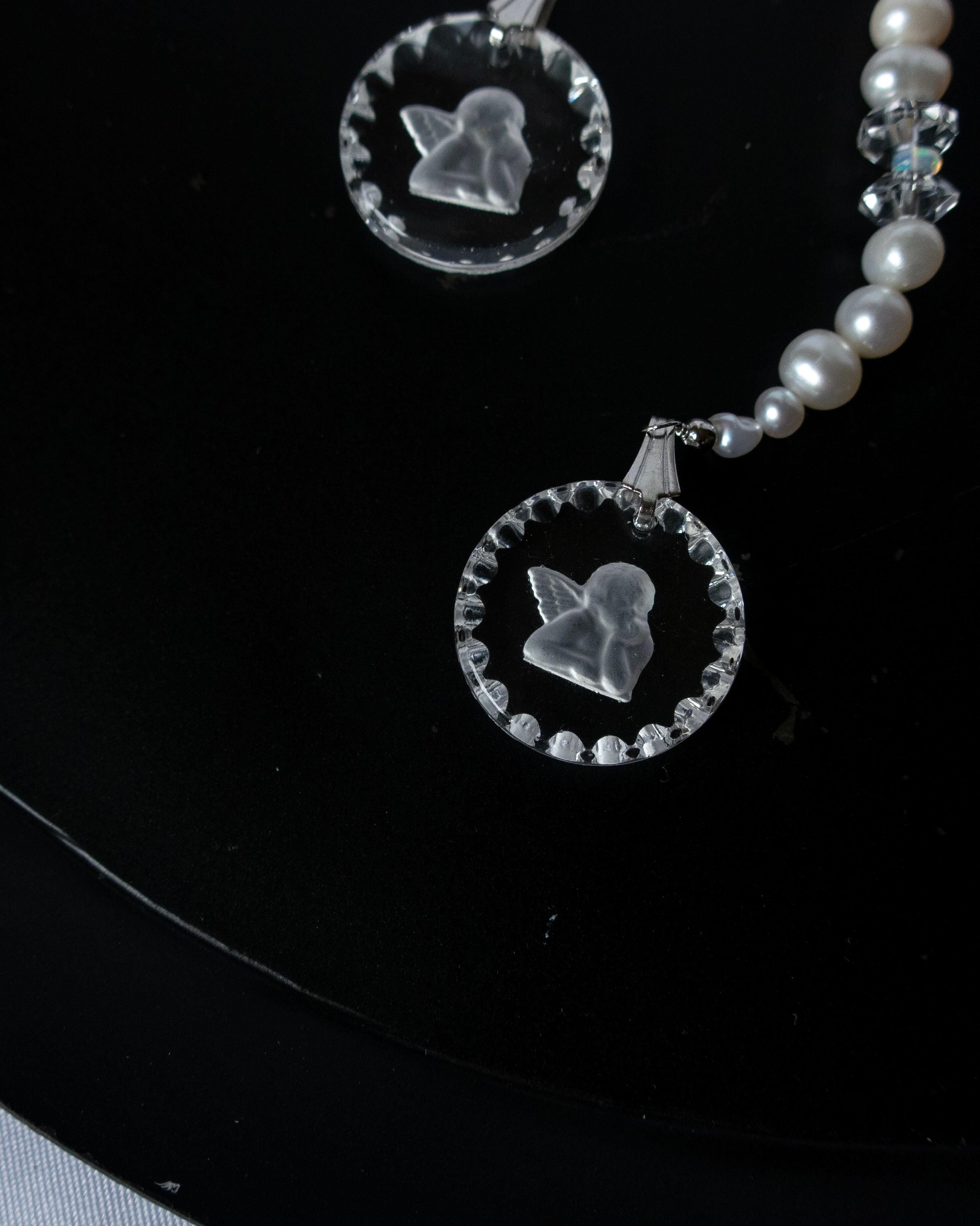 無彩色のガラスに浮かぶ天使が美しさ満点です。