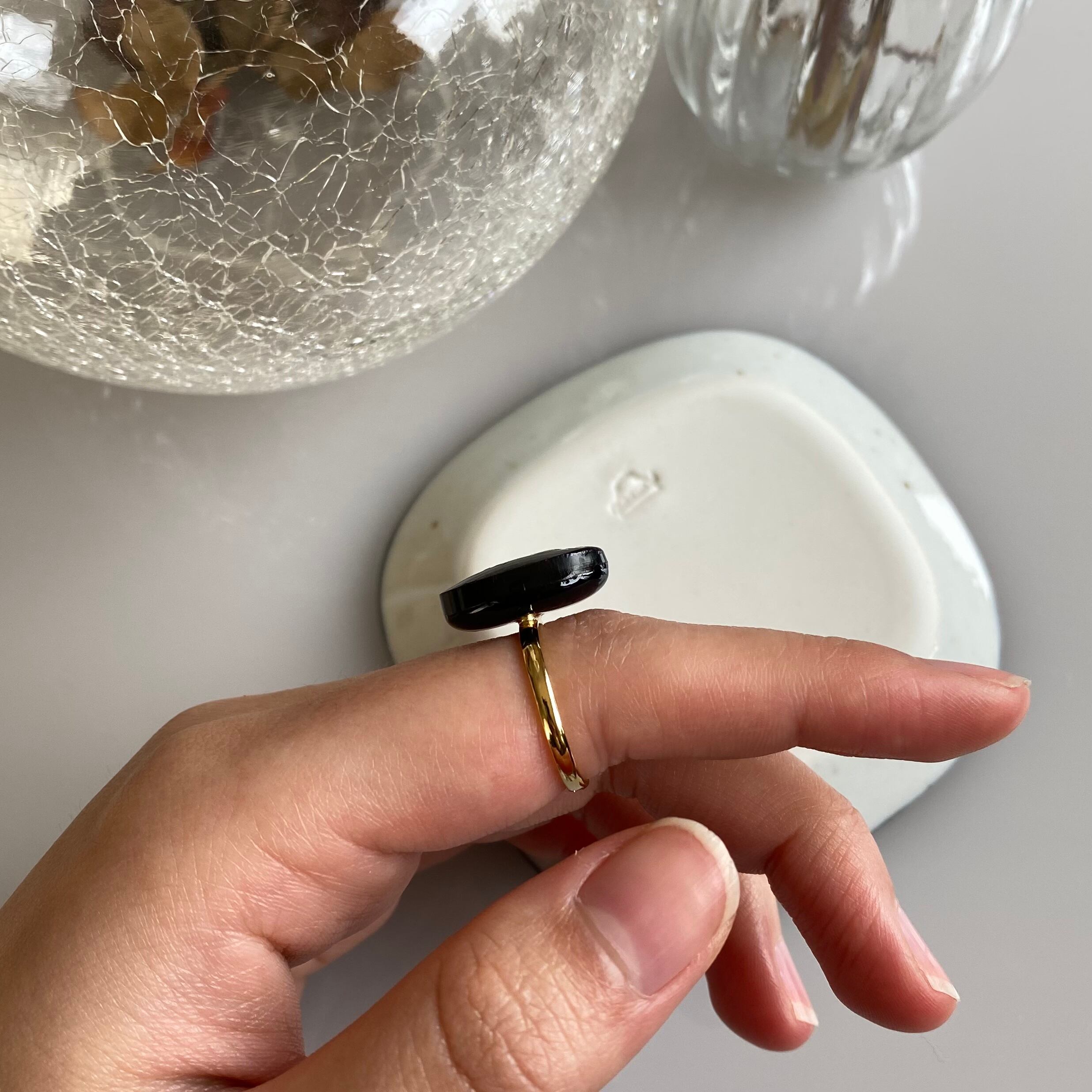 リングでおなじみの黒ガラスベースのガラスボタンには